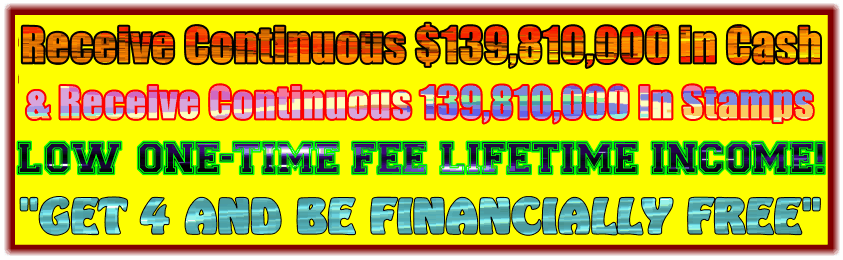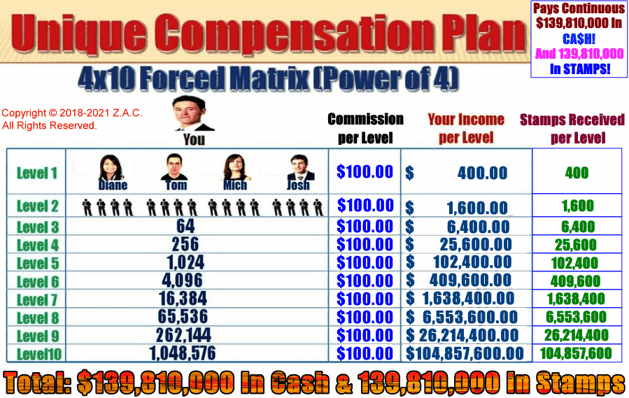 UNIQUE COMPENSATION PLAN 4x10 Forced Matrix (Power Of 4): This Cycle and Recycling and No Drop Out Features will MAKE YOU MILLIONAIRE When Your Sign-Up Bring In 4 New Members At $100 & 100 Forever Stamps Each = In Total You Get Paid $139,810,000 In Cash & 139,810,000 In Forever Stamps Continuously!