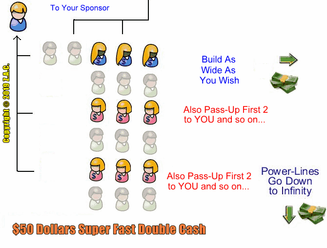 Here's How it Works: The first 2 people you enroll is "passed up" to your sponsor. But don't worry you are about to start your Own endless $50 Cash & 50 Stamps that will double and keep on Doubling to Infinity.
